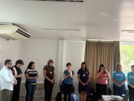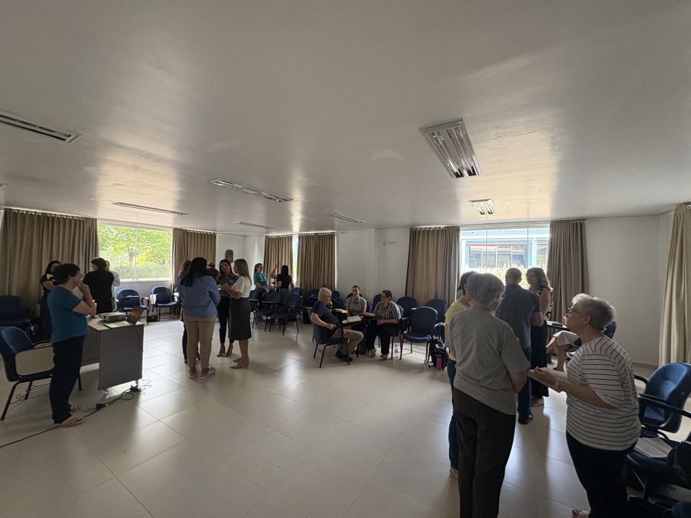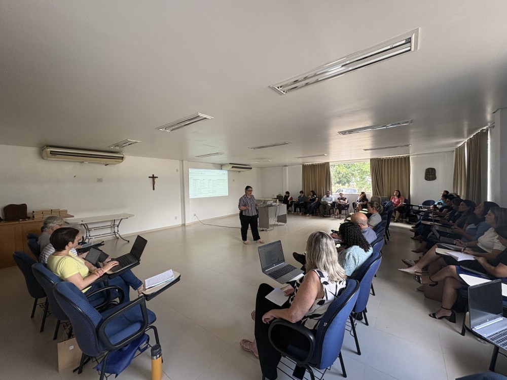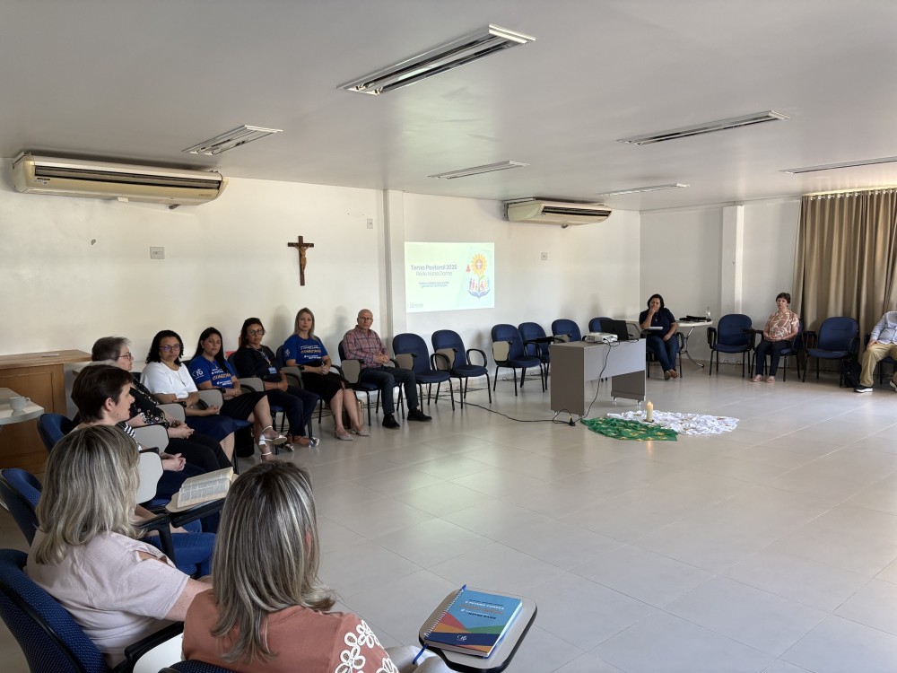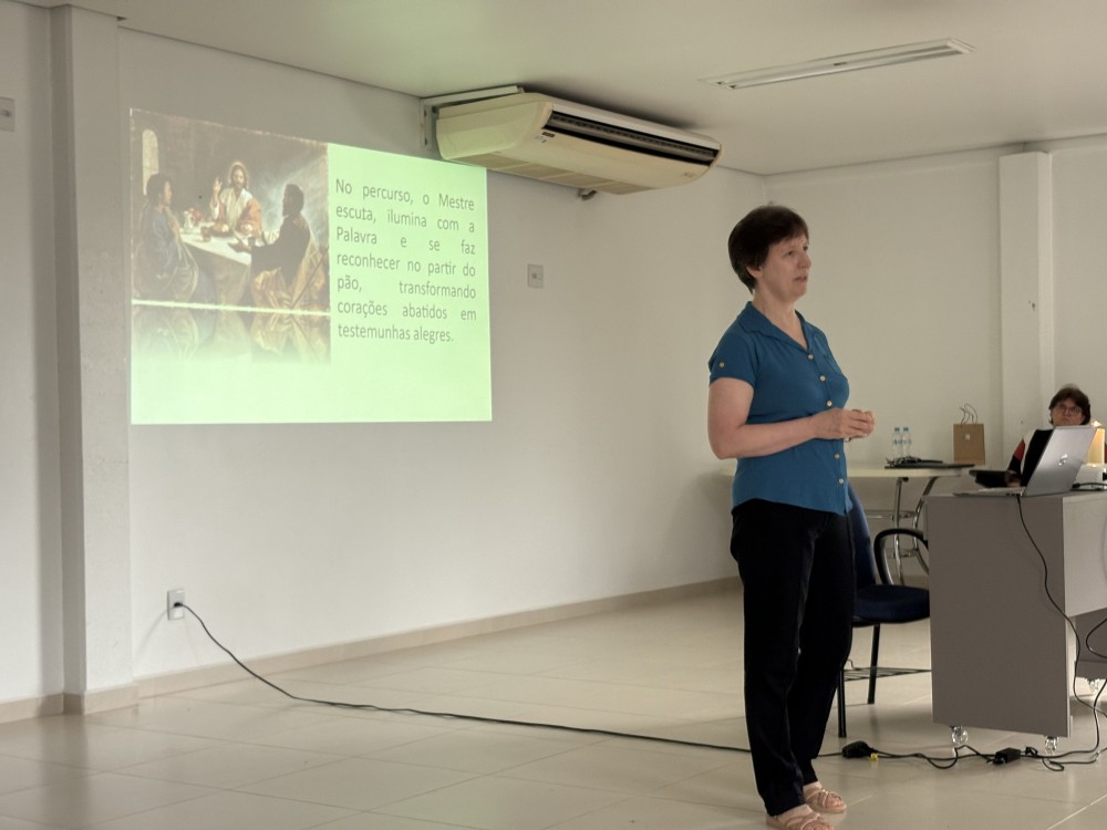 O segundo dia do Encontro teve início com um momento de espiritualidade em grupos, a partir da reflexão bíblica de Lucas 24,13-35, que suscitou partilhas sobre a escuta atenta, o caminhar juntos e o reconhecimento da presença de Deus no cotidiano da missão educativa.
