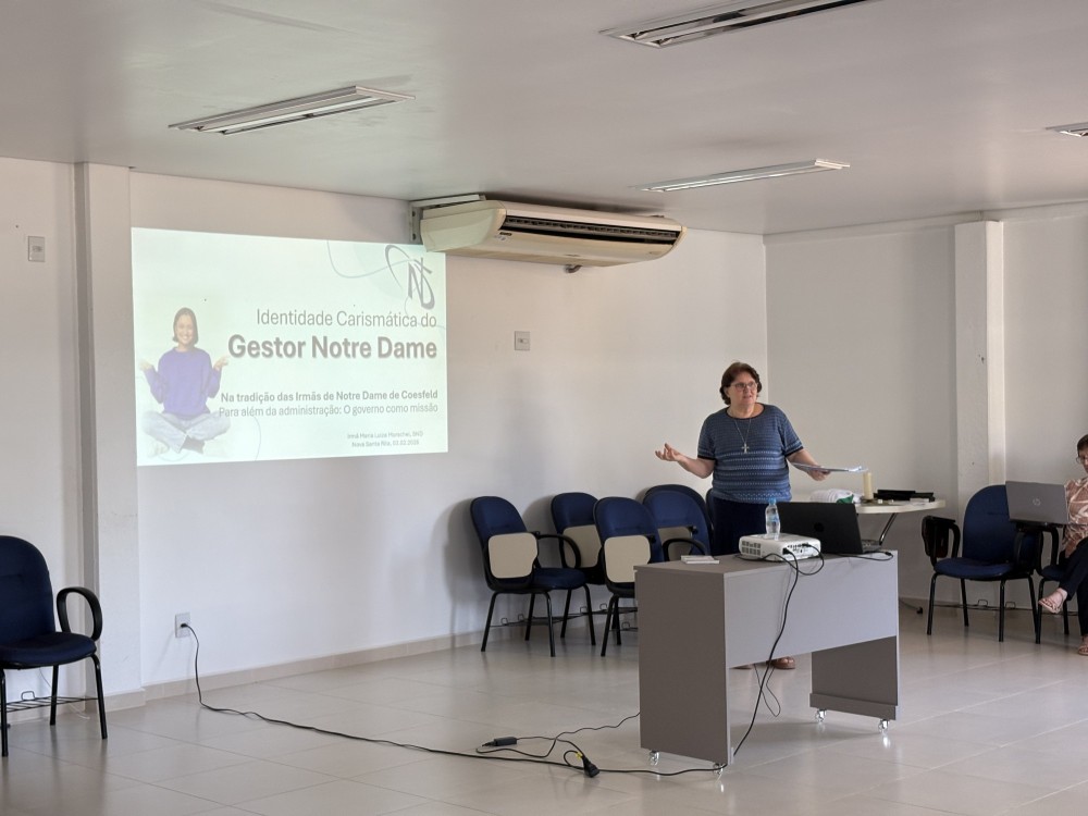 A identidade carismática do gestor Notre Dame foi aprofundada em reflexão conduzida pela Irmã Maria Luiza Morschel, que realizou um resgate histórico da Congregação das Irmãs de Notre Dame de Coesfeld. A partir da tradição da Congregação, destacou que, para além da missão educacional, o governo também é vivido como missão carismática, convidando os diretores a refletirem sobre os desafios de liderar no contexto do mundo atual.
